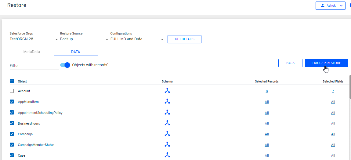 Important Note: Restore Source as nCino features will be displayed only for Salesforce Orgs configured with nCino objects. For detailed nCino restore features, refer to the article: nCino Restore Features.